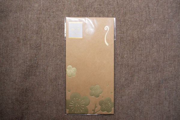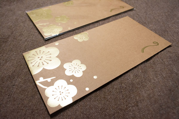 クラフト紙に、金箔加工の梅の文様。